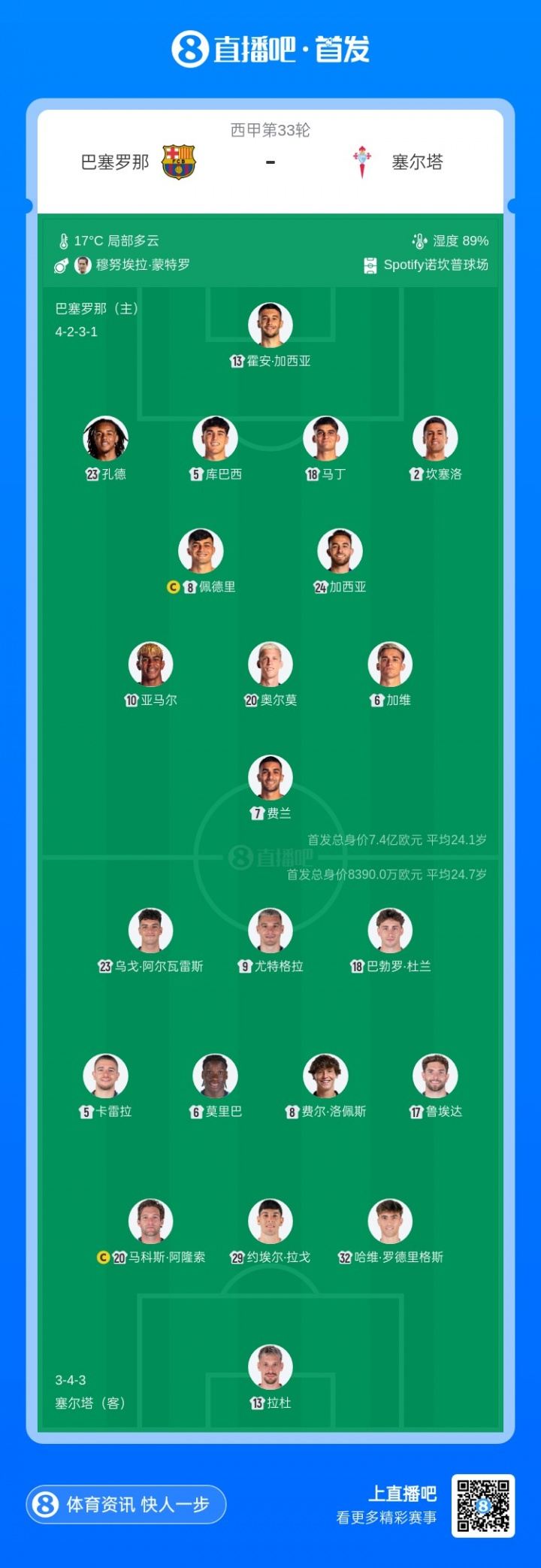 巴萨首发:13-霍安·加西亚、2-坎塞洛、5-库巴西、18-赫拉德·马丁、23-孔德、24-埃里克·加西亚、6-加维、8-佩德里、20-奥尔莫、7-费兰、10-亚马尔