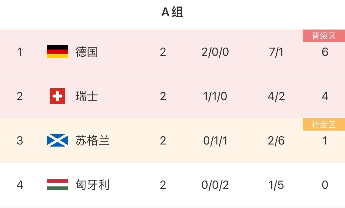 瑞士出线形势大好,末轮将对阵德国,打平即可出线。倒二的苏格兰、匈牙利直接对话,赢球可保留出线希望,输球直接出局,平局则基本两队一起出局。