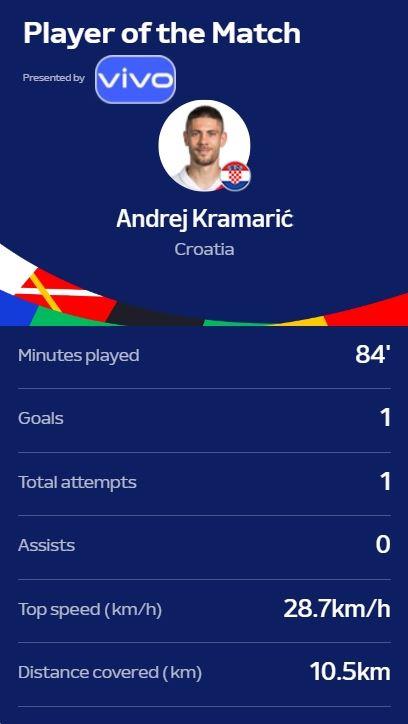 克拉马里奇当选克罗地亚2-2阿尔巴尼亚最佳球员,他在本场比赛中帮助克罗地亚打进一度扳平比分的进球。