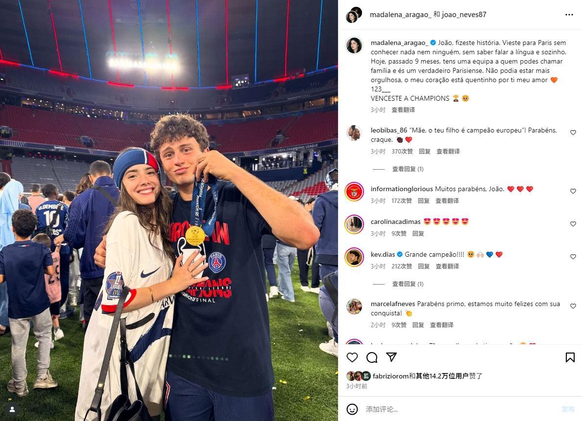欧冠决赛后,内维斯女友马达莱娜-阿拉贡(Madalena Aragão)发文:“若奥,你创造了历史。你孤身一人来到巴黎,人生地不熟,语言不通。九个月后的今天,你拥有了一支可称之为家的球队,更成为了真正的巴黎人。我无比自豪,亲爱的,我的心为你炽热燃烧🧡 123___你赢得了欧冠冠军啊!🏆🥹”
