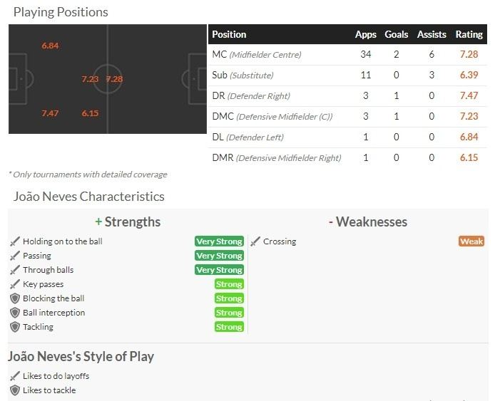 身材不高但下盘敦实,步频和速率出众,第一脚触球感觉极佳,行进中处理球能力不俗,抢断和争顶的时机选择非常成熟,传球和组织能力达到优秀10号的水准,若昂-内维斯既具备传统葡萄牙中场的细腻技术,还拥有与其外型不相称的防守能力和强悍作风。同样作为矮个中场,加维担任中前卫时需要借助一些超常规动作来完成防守动作,若昂-内维斯在控制犯规和吃牌方面的表现非常老道,出众的核心力量帮助他应对一切挑战。