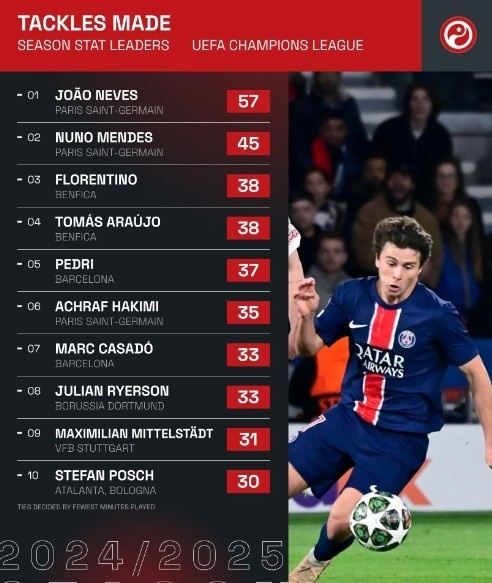 在跟随巴黎圣日耳曼登顶的过程中,若昂-内维斯在17场比赛中录得57次抢断,高居所有球员榜首,在欧冠历史上可以排到第4位,仅次于20年前的两位“大神”马斯切拉诺和加图索。除了封锁地面通道,若昂-内维斯场均还能送出1.2次威胁球、0.9次抢断和1次争顶。两回合对阵阿森纳“巨人阵”,若昂-内维斯共计赢得5次争顶,考虑到他的身高只有1米74,这样的空战能力只能用骇人来形容。