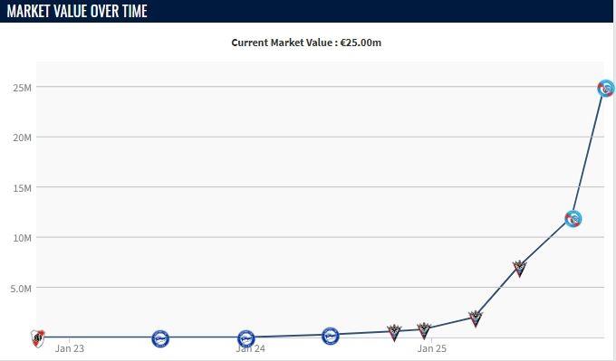 今日德转更新法甲球员身价,斯特拉斯堡前锋帕尼切利身价上涨1300万欧,达到2500万欧。