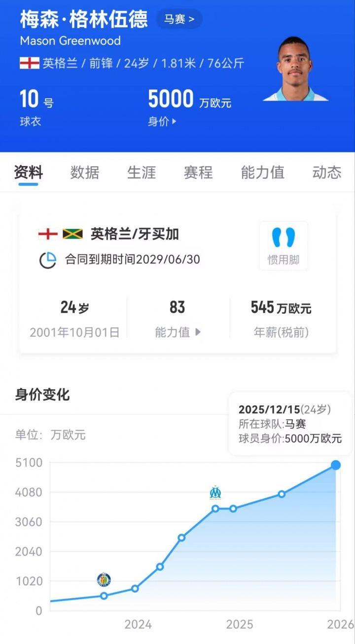 目前格林伍德的德转身价(去年12月15日更新)已经来到5000万欧元。20岁时,他曾因涉嫌家暴、强奸一度被停赛停训,德转身价也随之清零。但复出后,他还是逐渐展现出了自己的天赋,一步一步追平了自己被禁赛前的巅峰身价。不得不提的是,格林伍德如今也只有24岁。