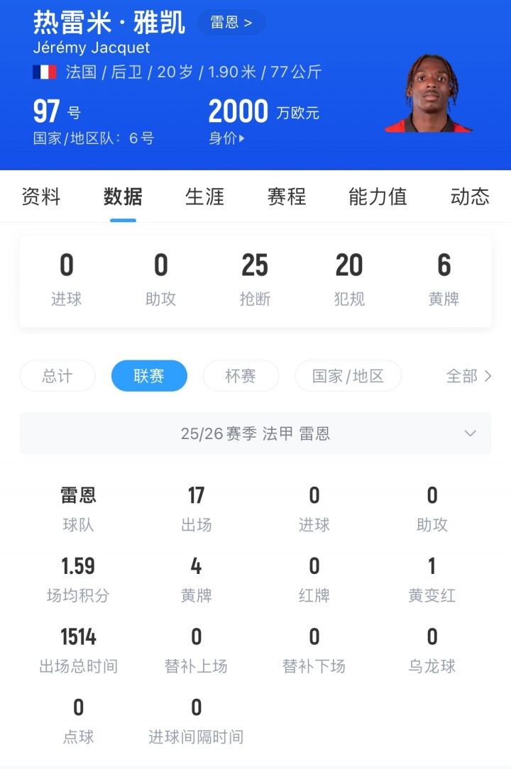 雅凯现年20岁,法国后卫,本赛季已为雷恩首发出场17场。目前其德转身价为2000万欧。