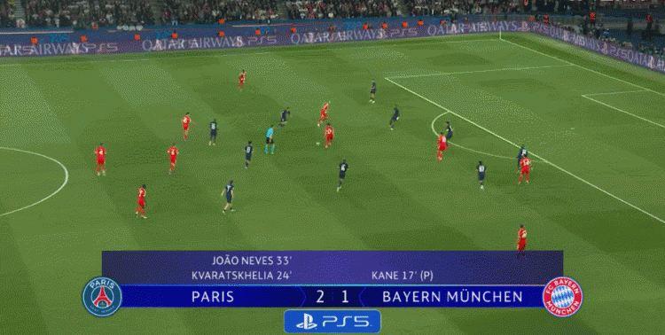 杜埃在快攻中制造角球,若昂·内维斯(身高1米74)抢前点头槌破门。身高1米89的法比安·鲁伊斯没有首发,拜仁忽视了对前点的防守,让葡萄牙后腰觅得良机。易边之后,巴黎圣日耳曼在短时间内连续破门,两粒进球都是纵贯全场的穿刺——无论是来自后卫的长传进攻,还是前锋回撤后的带球突击,巴黎圣日耳曼的进攻看起来都是畅通无阻,拜仁慕尼黑在高位压迫失败后,只能勉强做到回防到位,在这个过程中无法实现对持球人的施压。
