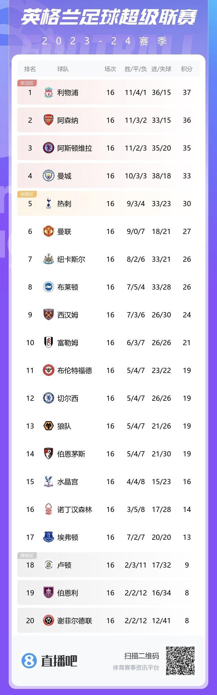 英超前16轮战罢,数据网站Opta的最新英超排名预测如下。