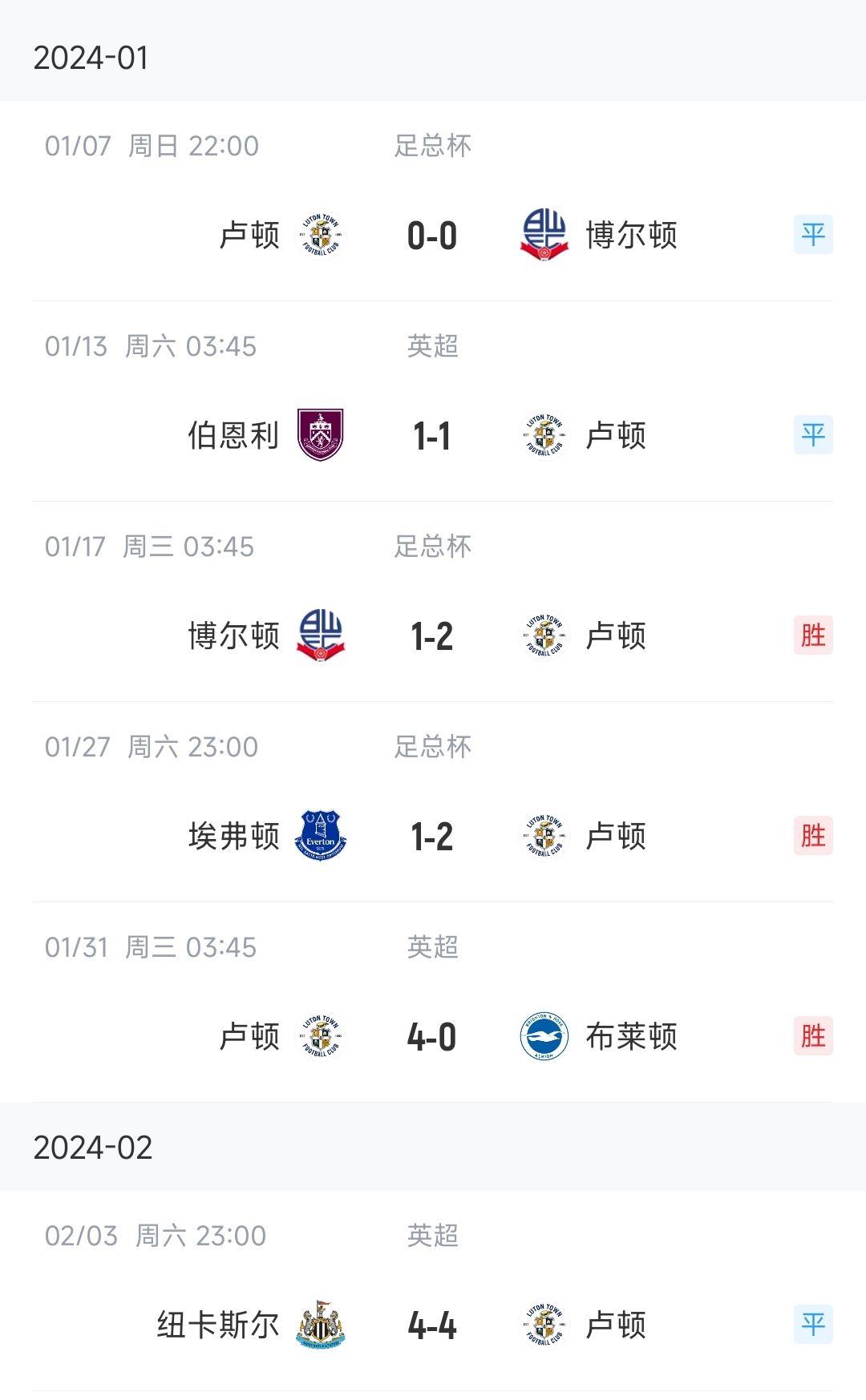 英超升班马卢顿2024年开年至今保持不败,球队连克博尔顿和埃弗顿杀入足总杯16强(将战曼城)。