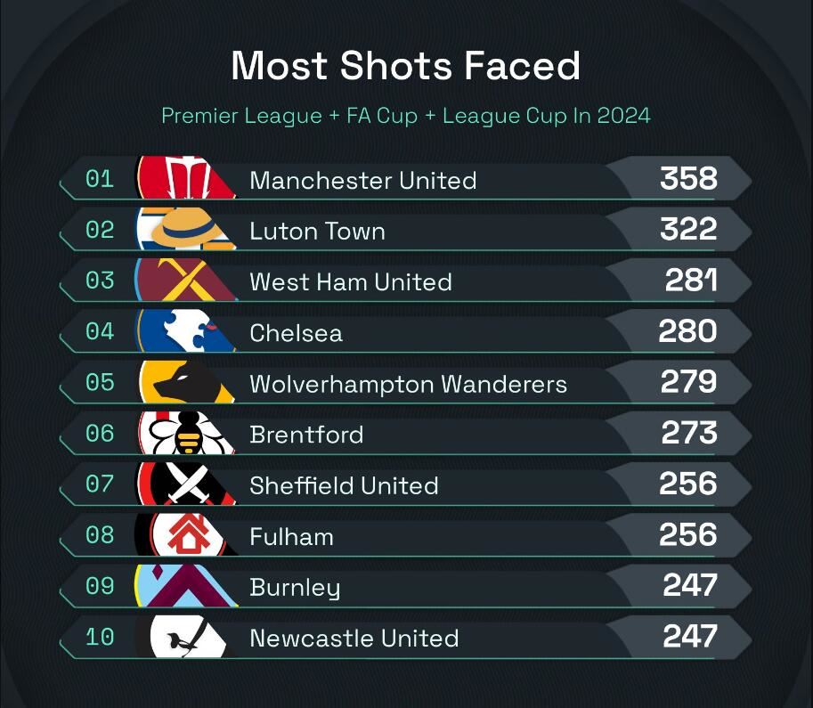 2024年英格兰国内赛事被射门次数排行榜↓