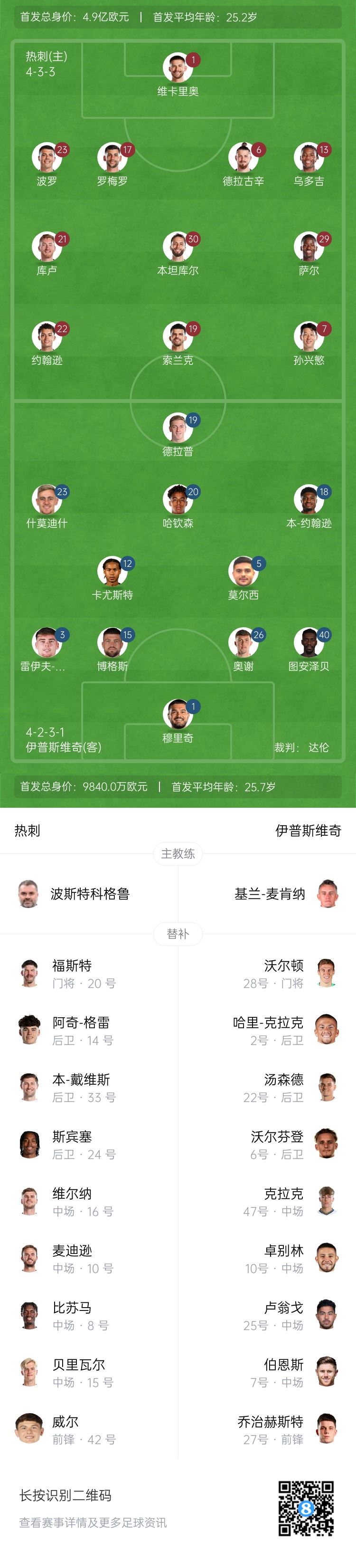 热刺替补:20-福斯特、24-斯宾塞、33-本-戴维斯、14-阿奇-格雷、8-比苏马、15-贝里瓦尔、10-麦迪逊、16-维尔纳、42-兰克希尔