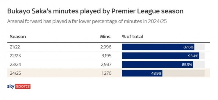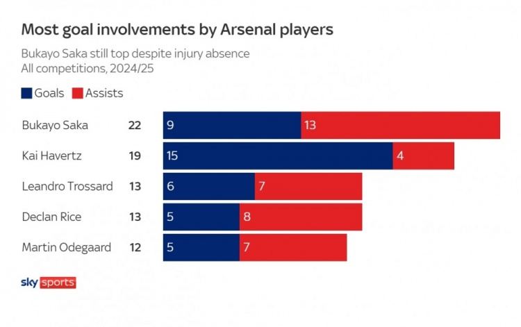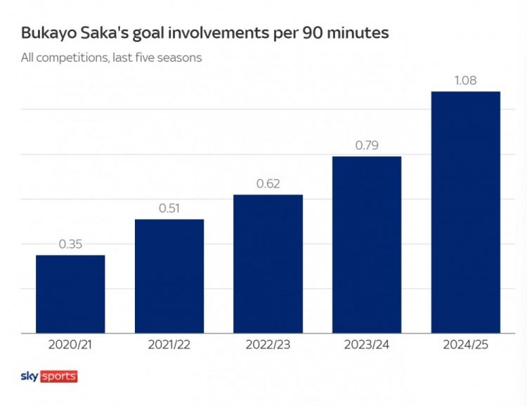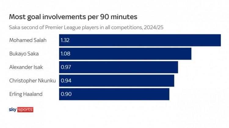 在去年12月对阵水晶宫的比赛中腿筋受伤前,萨卡在24场比赛中贡献了22球(进球与助攻),比队内其他任何球队都至少多3球。