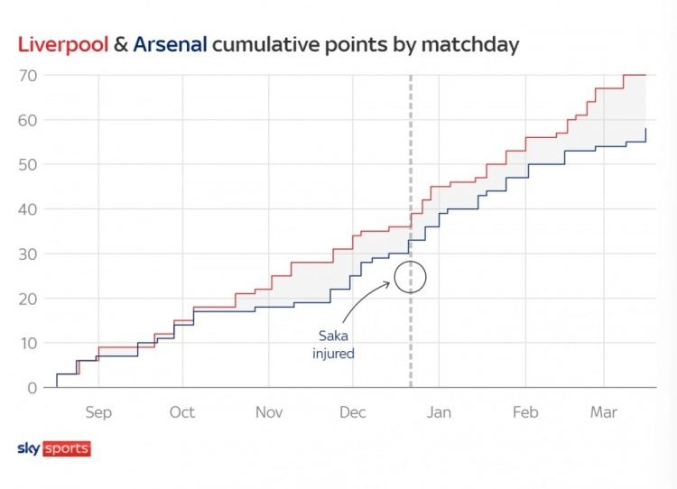 总体而言,这些伤病对球队造成了沉重打击。但毫无疑问的事,萨卡的受伤对阿森纳影响最大。萨卡在对阵水晶宫那场比赛受伤之时,阿森纳与利物浦的积分差距不过3分,但如今两队之间的分差已经达到了12分。