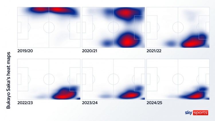 萨卡在阿尔特塔执教初期的几个月里,也曾出现在左后卫的位置上,并在2020/2021赛季扮演过左边锋的角色。但如今他已经被固定在右边锋的位置上。