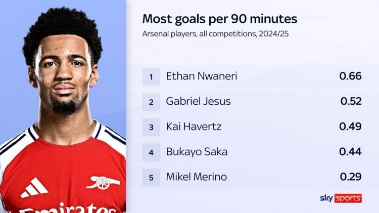 而且从最近恩瓦内里的数据来看,阿尔特塔真的必须尽早找到解决方案才行。18岁的恩瓦内里目前已经为球队攻入8球,且4球是在萨卡伤缺之时攻入的——使他成为阿森纳本赛季的第三得分手,并证明了他的有效性。