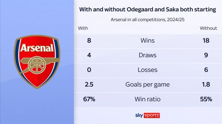 当然,评估厄德高状态不能仅归因于萨卡的存在,但这无疑是重要因素。数据有力印证了二人在场上的化学反应。