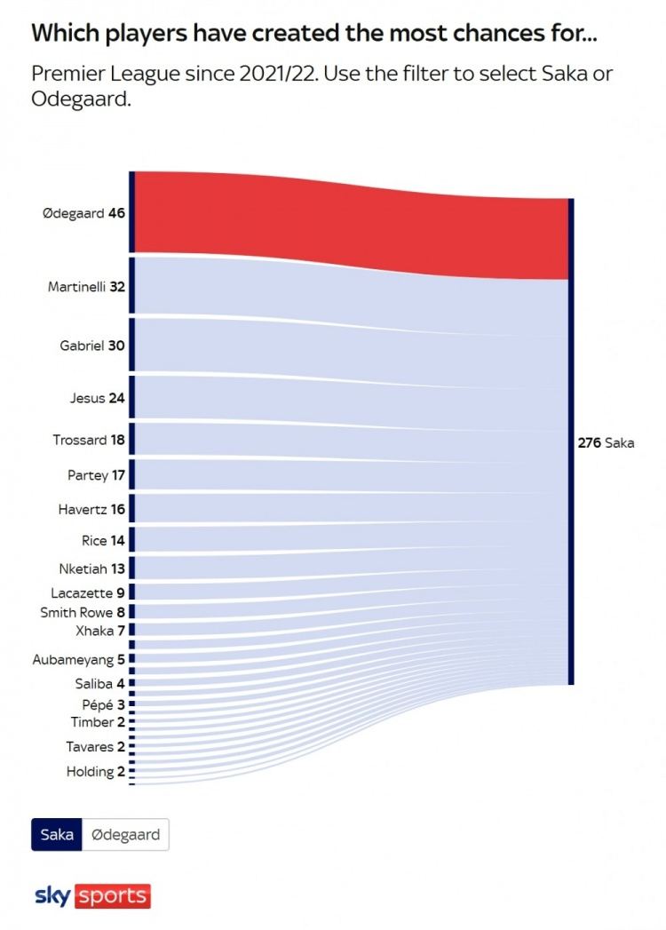 下方图表就解析了自2021/22赛季初厄德高从皇马永久转会阿森纳以来,他与萨卡相互创造机会的全貌。