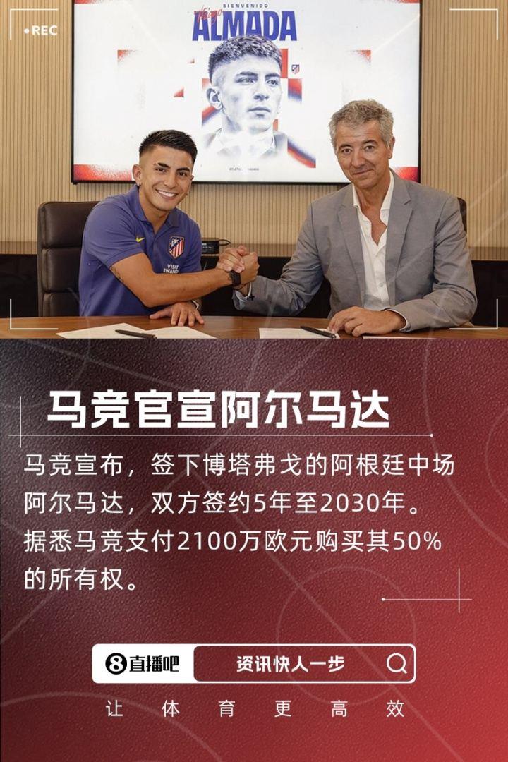 官方消息,马竞签下24岁阿根廷中场阿尔马达,双方签约5年,根据此前报道,马竞将支付2100万欧,购买阿尔马达50%所有权。