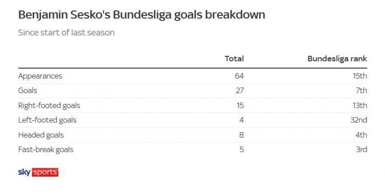 过去两个赛季,塞斯科在德甲的进球纪录