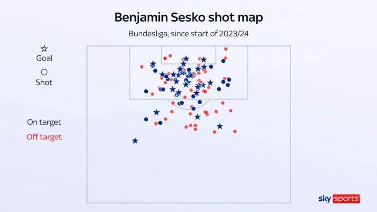 另一方面,塞斯科愿意从刁钻角度和不太可能的位置起脚射门,但有时表现也会令人沮丧。他过去两个德甲赛季的射门点位图显示,从数据上看,他很大比例的射门转化为进球的概率其实并不高。