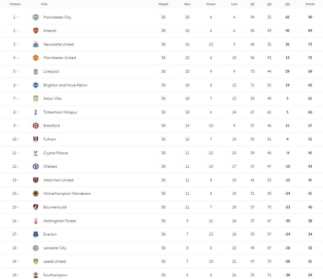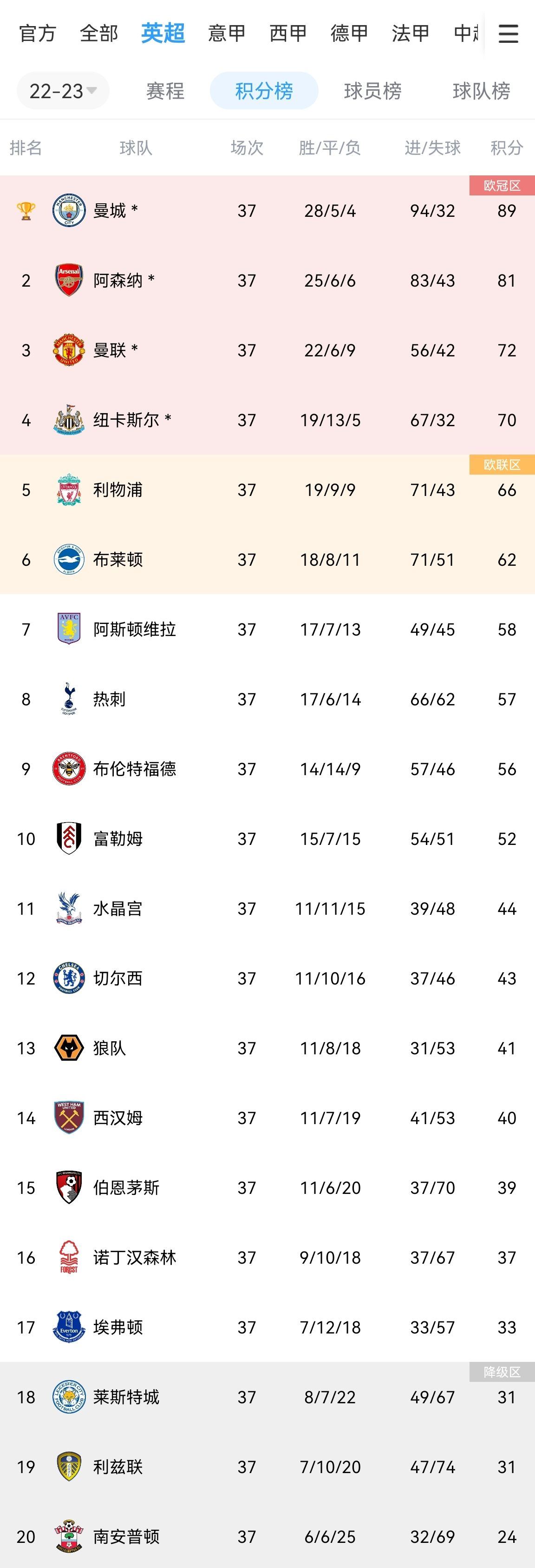 英超第38轮收官战10场同时打响,赛中实时积分榜排名变动,请关注此帖。