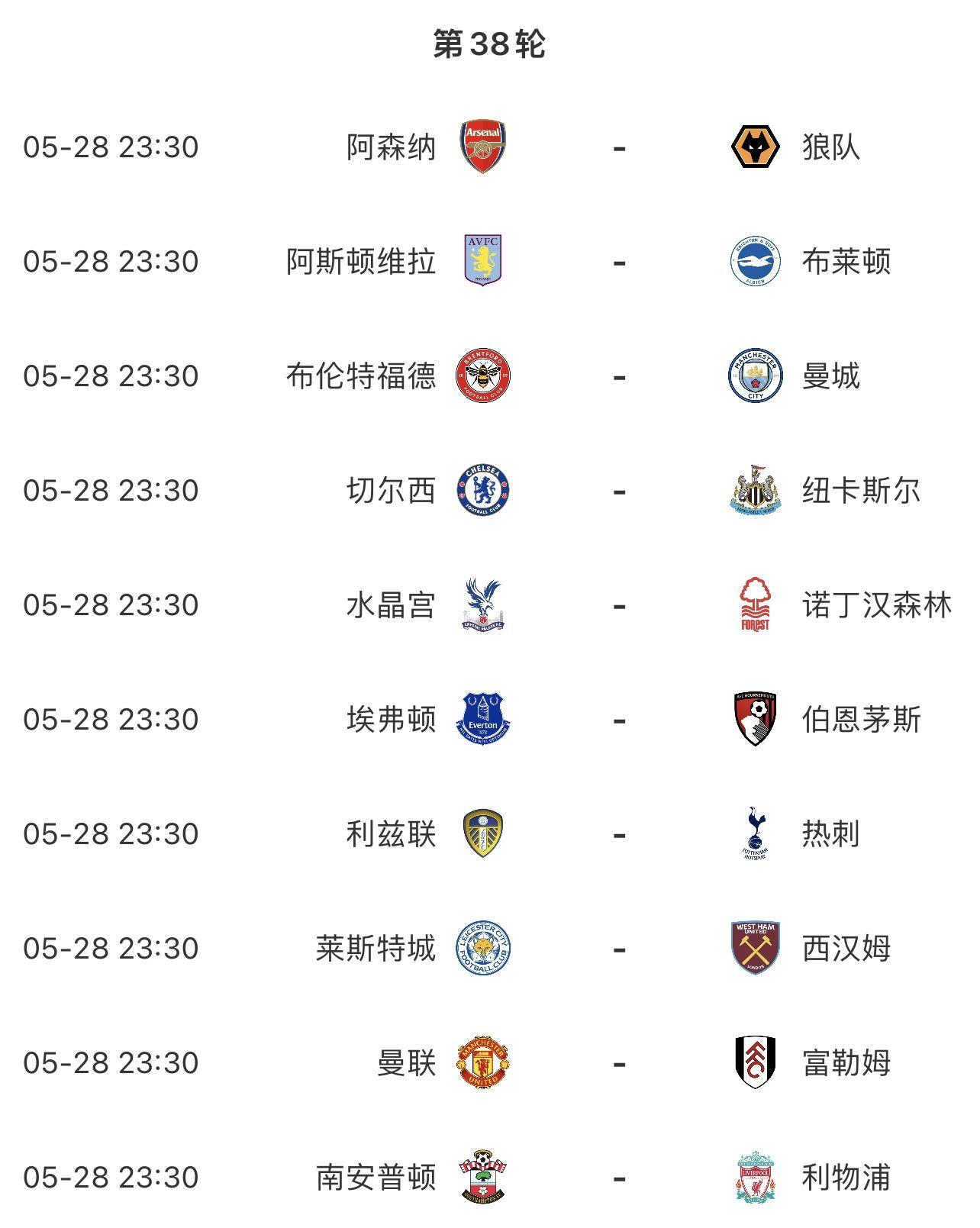 【英超收官战对阵】