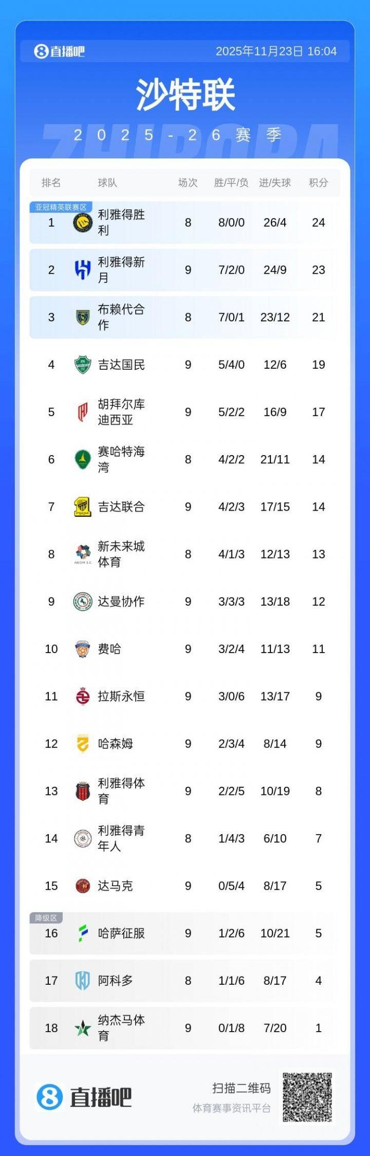 沙特联第9轮,利雅得新月2-1击败哈萨征服,联赛7胜2平保持不败,多赛一轮暂时落后榜首利雅得胜利1分。