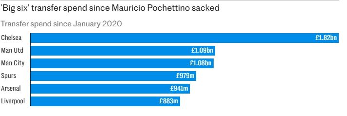 搜体育 足球资讯 波切蒂诺下课后BIG6转会支出:切尔西18亿镑领跑 热刺9.79亿镑第4
