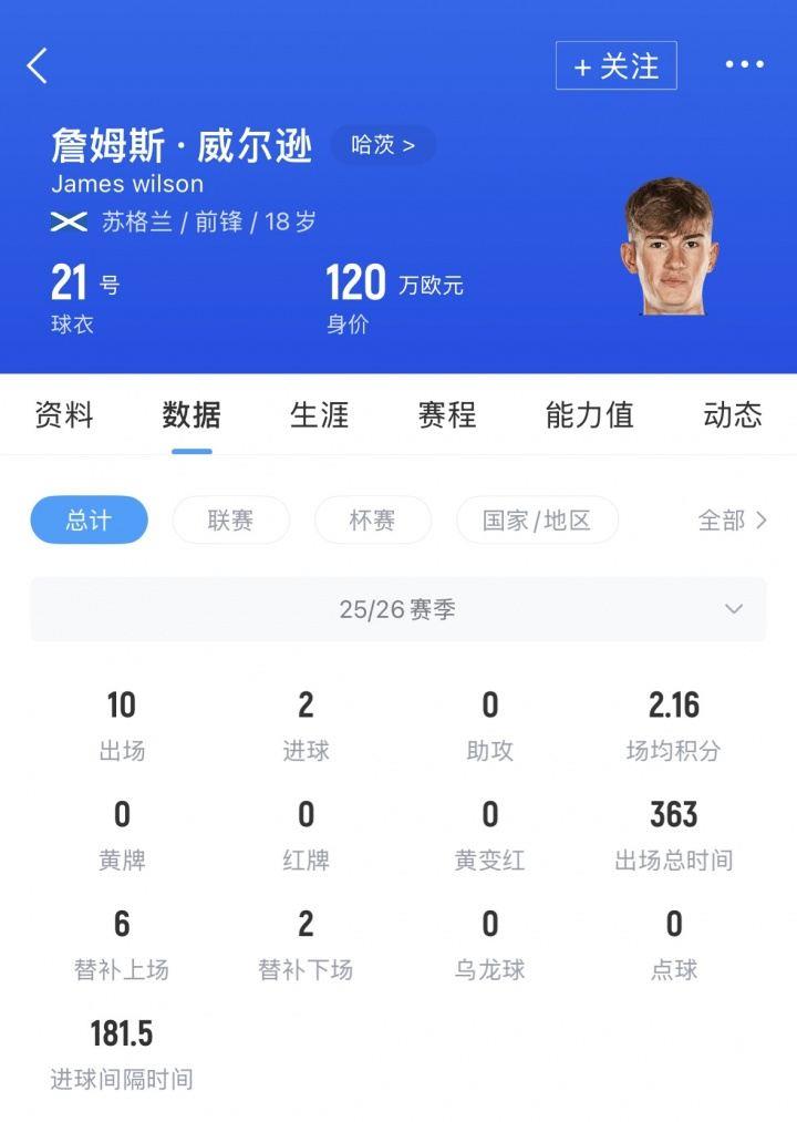 詹姆斯·威尔逊现年18岁,位置前锋,出自哈茨青训,2024年被哈茨升至1线队,他上赛季代表哈茨出战32场,贡献6球3助攻,本赛季代表哈茨共出战10场,贡献2球。