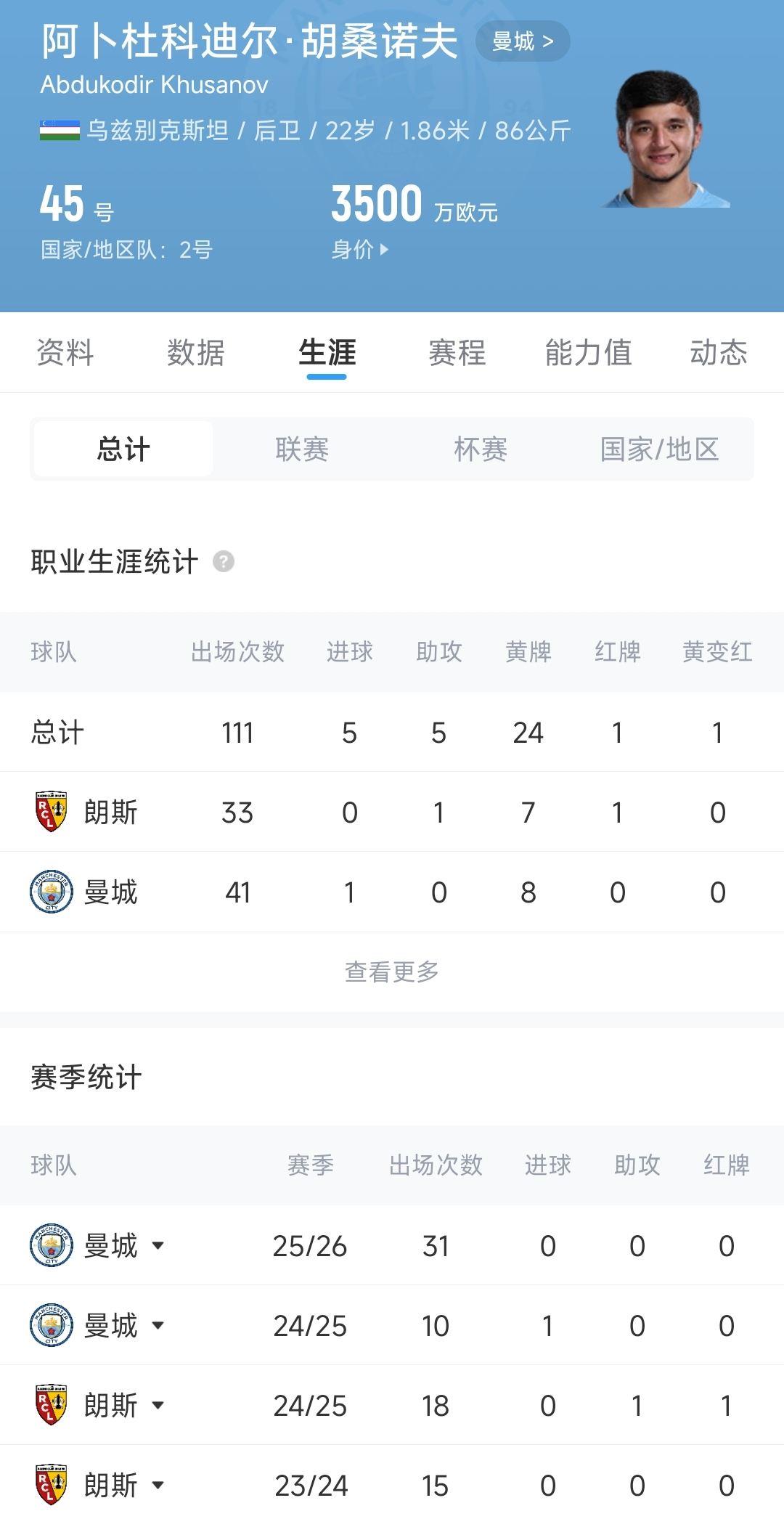 去年冬窗胡桑诺夫以4000万欧元的转会费加盟曼城,本赛季代表曼城出战了31场比赛,目前胡桑诺夫的德转身价为3500万欧元。