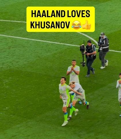 赛后曼城全队向球迷谢场时,胡桑诺夫有些不好意思接受球迷的掌声,哈兰德一把把他推到了球迷面前。