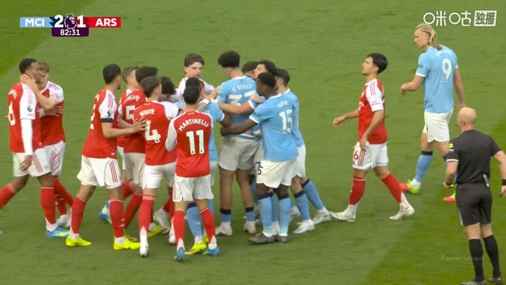 曼城vs阿森纳第83分钟,哈兰德、加布里埃尔顶牛两队爆发冲突,两人各吃一黄!