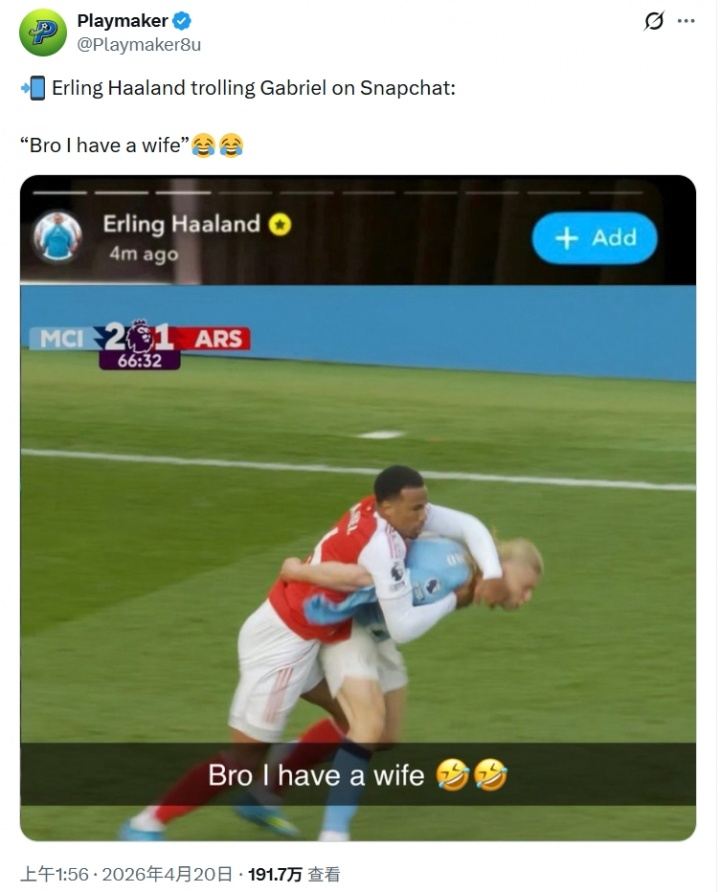 赛后,网络上流传出一张哈兰德Snapchat的快拍截图,上面是哈兰德扛着加布里埃尔的比赛瞬间画面,哈兰德配文:兄弟,我有老婆了🤣🤣