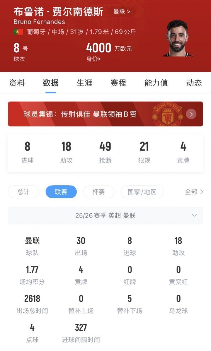 曼联本赛季还剩5场英超,将分别对阵布伦特福德、利物浦、桑德兰、诺丁汉森林和布莱顿,B费很有机会打破这一纪录。