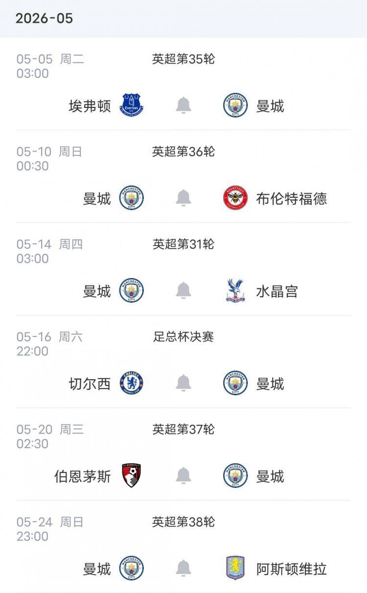 紧接着,球队还须在5月19日客场挑战伯恩茅斯,然后是5月24日主场迎战阿斯顿维拉。曼城方面提出将客场对阵伯恩茅斯的比赛安排在5月12日,将主场对水晶宫放在5月21日,从而在十天内完成三场比赛,但这一方案被英超拒绝。
