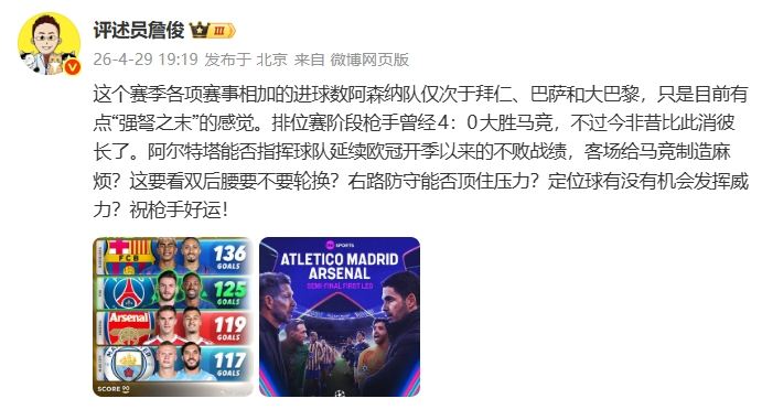 明日凌晨3:00欧冠半决赛首回合,阿森纳将客场挑战马竞,赛前评述员詹俊社媒分享了他对于阿森纳的看法。