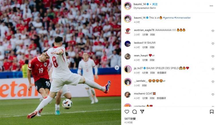 鲍姆加特纳晒出了自己进球瞬间的比赛照:“这就是奥地利。”