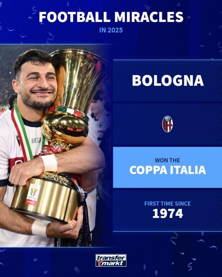 博洛尼亚1974年之后首次夺得意大利杯冠军