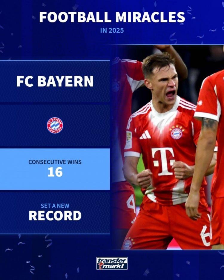 德国转会市场盘点2025年足坛“奇迹”,库拉索进军世界杯,拜仁赛季开局16连胜在列。